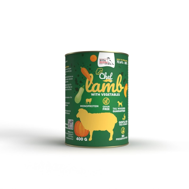 W linii Chef od Sytej Michy znajduje się aż 92,6% produktów pochodzenia zwierzęcego, w stosunku 72.6% mięsa mięśniowego z jagnięcina do 20% jagnięcych podrobów (10% żołądki, 5% serca, 5% wątróbka).