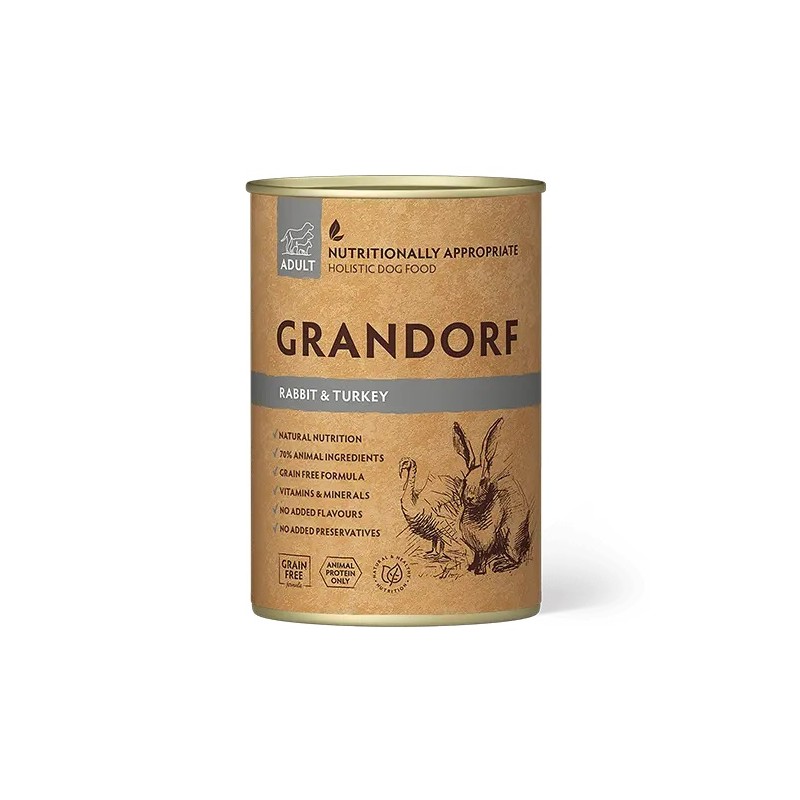Grandorf Rabbit & Turkey to idealna dla psów o wrażliwym układzie pokarmowym lub skłonnych do alergii. Kompletna, naturalna, hipoalergiczna mokra karma dla psów. Mięso i nic zbędnego. Używane są wyłącznie wysokiej jakości surowce gotowane na parze lub chłodzone, a nie mrożone.