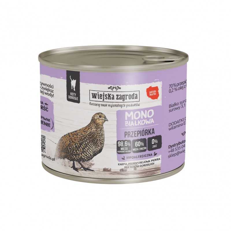 Skład: 70% przepiórka (60% mięso, 10% wątroba), 28,6% bulion z przepiórki, 1% minerały, 0,2% olej z łososia, 0,1% drożdże piwne suszone, 0,1% ekstrakt Yucca Mojave.