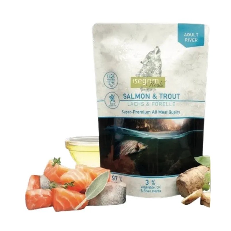 Pełnoporcjowa, bezzbożowa mokra karma dla psów wszystkich ras, stworzona z świeżego mięsa łososia i pstrąga, gotowana w aromatycznym bulionie i wzbogacona topinamburem, olejem z krokosza barwierskiego oraz wyselekcjonowanymi ziołami górskimi. Dzięki wysokiej wilgotności (~78 %) jest lekka, soczysta i wyjątkowo smakowita