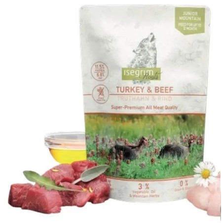Pełnoporcjowa, bezzbożowa mokra karma dla szczeniąt wszystkich ras, stworzona z świeżego mięsa indyka oraz wołowiny, gotowana w aromatycznym bulionie i wzbogacona pasternakiem, olejem z łososia oraz wyselekcjonowanymi ziołami górskimi. Dzięki wysokiej wilgotności (~78 %) jest lekka, soczysta i wyjątkowo smakowita