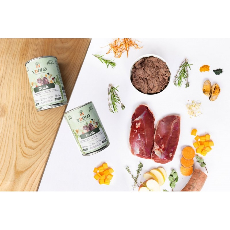 Skład: 90% świeża kaczka (70% mięso mięśniowe, 20% organy wewnętrzne), 5% bataty, 3% mieszanka prozdrowotna: (banan (5982 mg/kg), karczoch (4486 mg/kg), cykoria (4813 mg/kg), lucerna (2393 mg/kg), jabłka (2094 mg/kg), dynia (1794 mg/kg), żurawina (1495 mg/kg), małża zielonowargowa 1346 mg/kg), zielona herbata (1196 mg/kg), rozmaryn (1047 mg/kg), tymianek (897 mg/kg), oregano (748 mg/kg), ostropest plamisty (269 mg/kg), spirulina (239 mg/kg), oliwa z oliwek (209 mg/kg), jukka, cordyceps (179 mg/kg), shiitake, mniszek lekarski, imbir, kurkuma), 1% olej z pstrąga, glukozamina (1000 mg/kg), chondroityna (850 mg/kg), MSM (650 mg/kg).