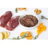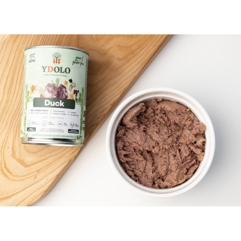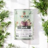 Wyraziste w smaku mięso kaczki przekona każdego niejadka. Starannie wybrane świeże składniki i delikatny proces produkcji tworzą karmę, która jest zdrowa i wyjątkowo smaczna. Do produkcji karmy użyto świeżą kaczkę (90%), w tym 70% mięsa mięśniowego i 20% wartościowych podrobów. Skład uzupełniają naturalne składniki wspierające zdrowie i dobrą kondycję psa warzywa, owoce, zioła oraz dodatki superfood. Karma została wzbogacona o wyjątkową kompozycję składników poprawiającą odporność i pomagającą w walce z alergią, w której skład wchodzi kordaceps, shiitake i kurkuma.