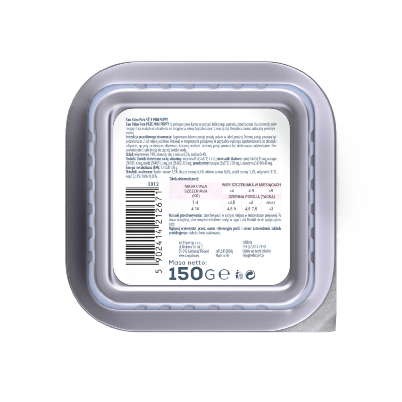 Karma Raw Paleo Pate Mini Puppy Pork jest kompletną i zbilansowaną karmą, w postaci delikatnego i wyjątkowo smakowitego pasztetu, przeznaczoną dla zdrowych szczeniąt ras małych. Receptura karmy oparta jest tylko na jednym źródle białka zwierzęcego, którym jest wieprzowina, co pomaga ograniczyć ryzyko wystąpienia alergii pokarmowych. Bez dodatku zbóż.