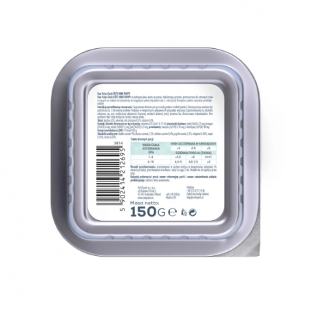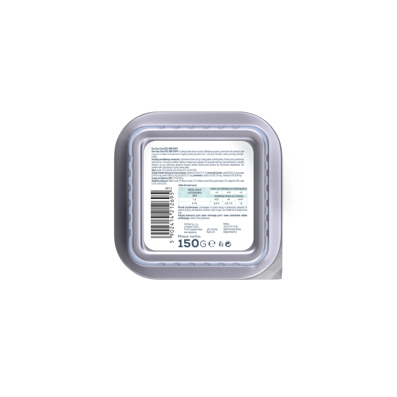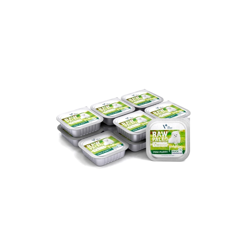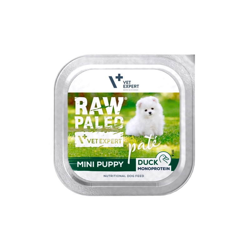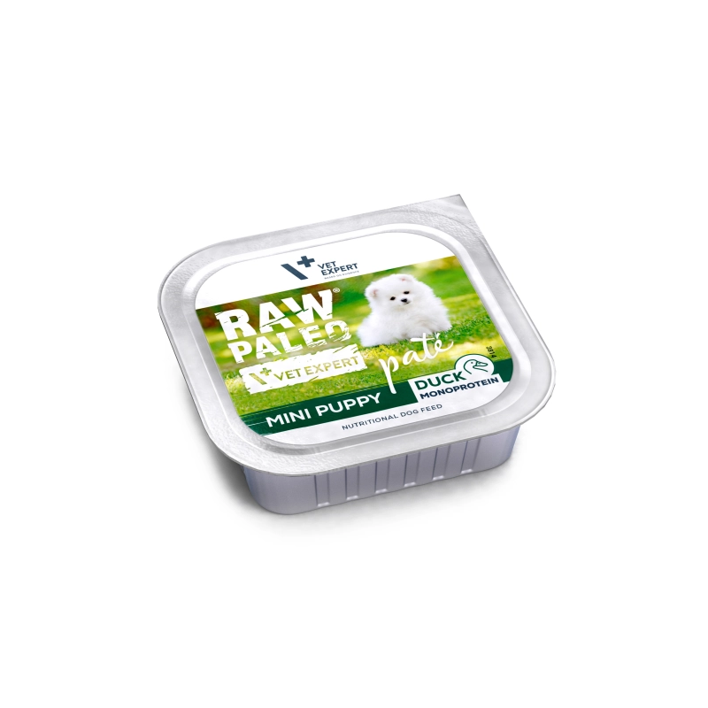 Karma Raw Paleo Pate Mini Puppy Duck jest kompletną i zbilansowaną karmą, w postaci delikatnego i wyjątkowo smakowitego pasztetu, przeznaczoną dla zdrowych szczeniąt ras małych. Receptura karmy oparta jest tylko na jednym źródle białka zwierzęcego, którym jest kaczka, co pomaga ograniczyć ryzyko wystąpienia alergii pokarmowych. Bez dodatku zbóż.