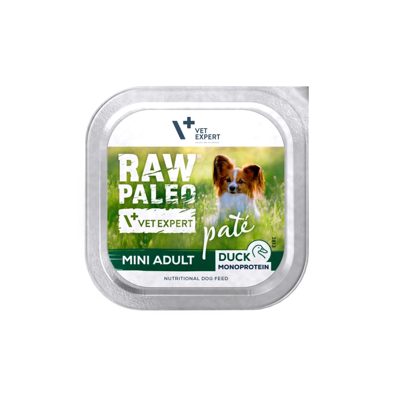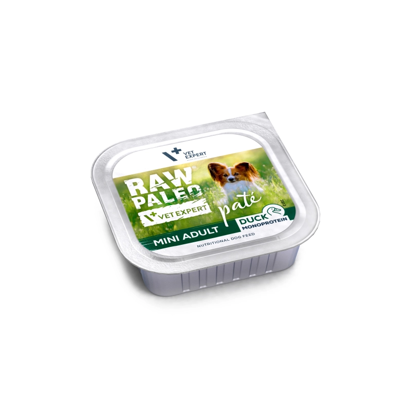 Karma Raw Paleo Pate Mini Adult Duck jest kompletną i zbilansowaną karmą, w postaci delikatnego i wyjątkowo smakowitego pasztetu, przeznaczoną dla zdrowych psów ras małych. Receptura karmy oparta jest tylko na jednym źródle białka zwierzęcego, którym jest kaczka, co pomaga ograniczyć ryzyko wystąpienia alergii pokarmowych. Bez dodatku zbóż.