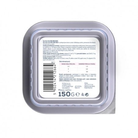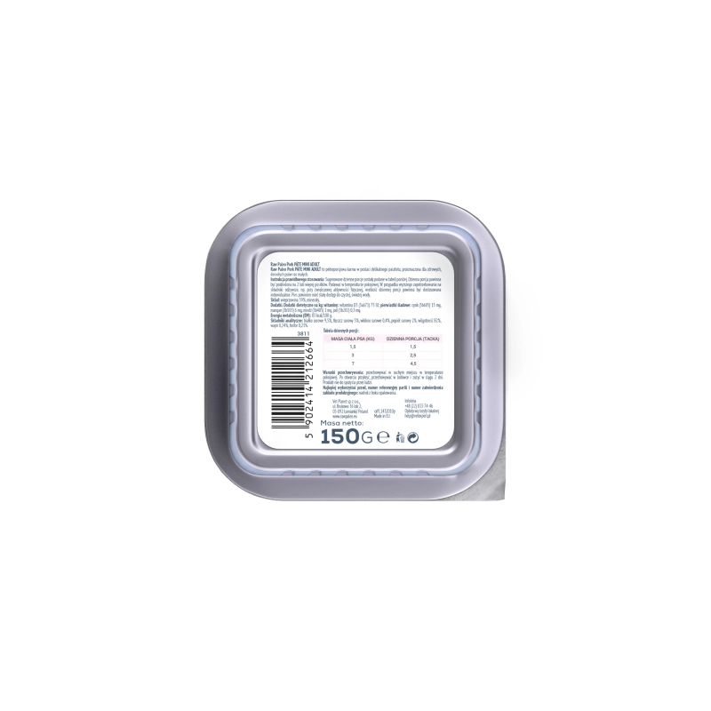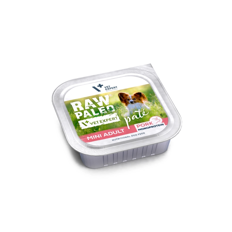 Karma Raw Paleo Pate Mini Adult Pork jest kompletną i zbilansowaną karmą, w postaci delikatnego i wyjątkowo smakowitego pasztetu, przeznaczoną dla zdrowych psów ras małych. Receptura karmy oparta jest tylko na jednym źródle białka zwierzęcego, którym jest wieprzowina, co pomaga ograniczyć ryzyko wystąpienia alergii pokarmowych. Bez dodatku zbóż.
