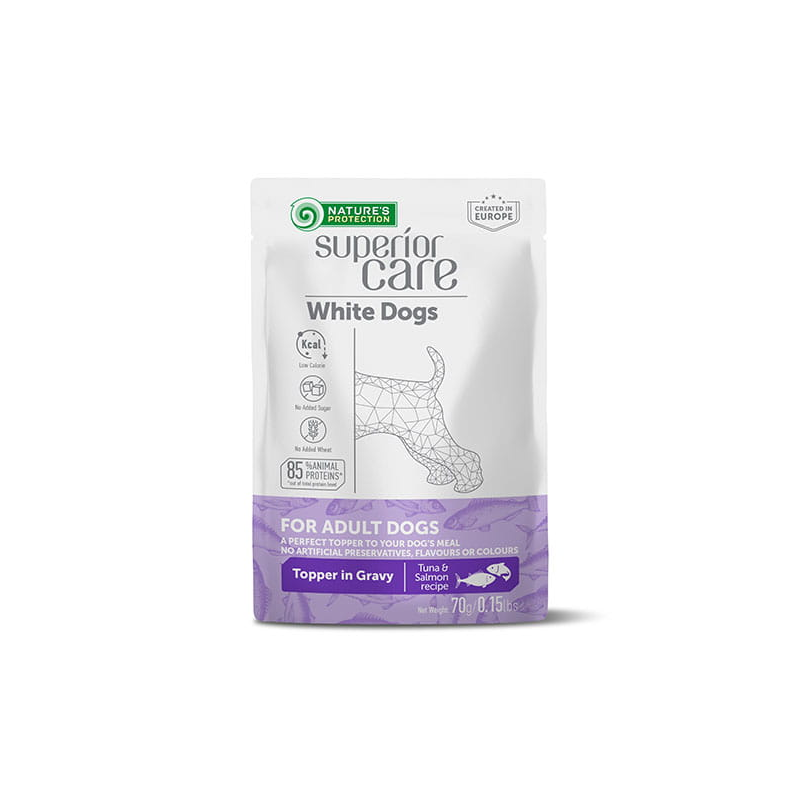 Pełnoporcjowa karma mokra z pysznym tuńczykiem z dodatkiem łososia dla dorosłych psów białych ras