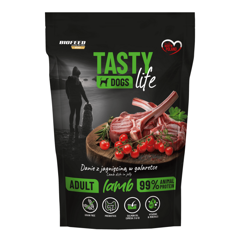 Pełnoporcjowa karma mokra dla dorosłych psów wszystkich ras, bogata w jagnięcinę.