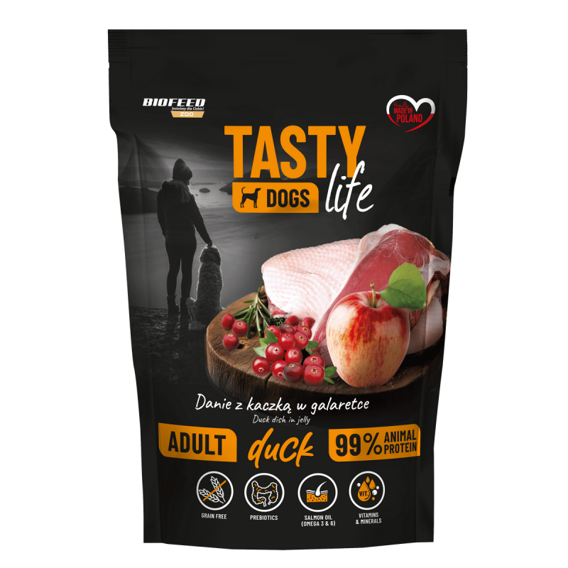 Pełnoporcjowa karma mokra dla dorosłych psów wszystkich ras, bogata w kaczkę.