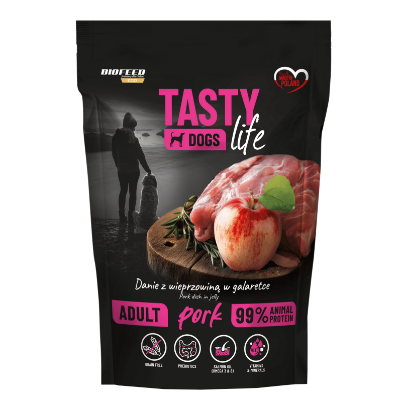 Pełnoporcjowa karma mokra dla dorosłych psów wszystkich ras, bogata w wieprzowinę.
