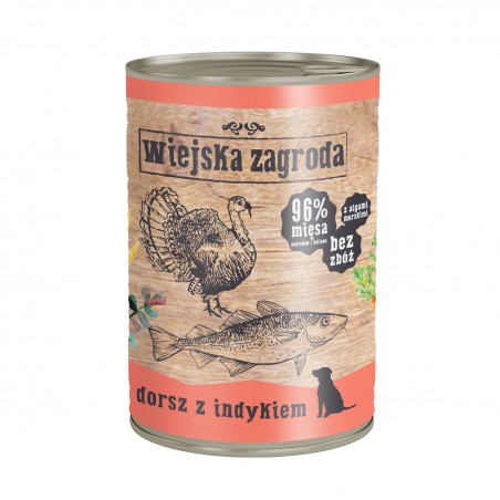 Wiejska Zagroda Dorsz z Indykiem to pełnoporcjowa mokra karma dla psów.