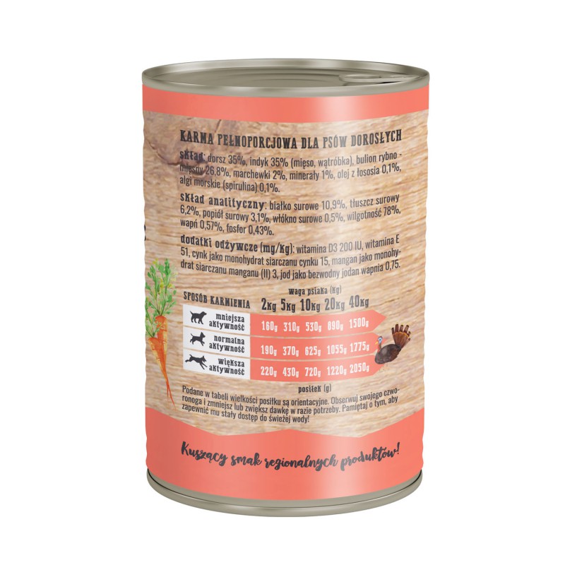 Skład: 35% ryb (dorsz), 35% indyk (mięso, wątróbka), 2% marchewki, 26,8% bulion mięsny, 1% minerały, 0,1% olej z łososia, 0,1% algi morskie (spirulina)