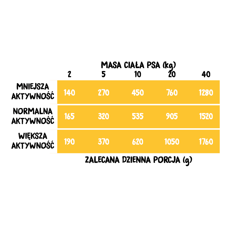 Sposób karmienia: Podane w tabeli wielkości posiłku są orientacyjne. Obserwuj swojego czworonoga I zwiększ bądź zmniejsz wielkość posiłku.