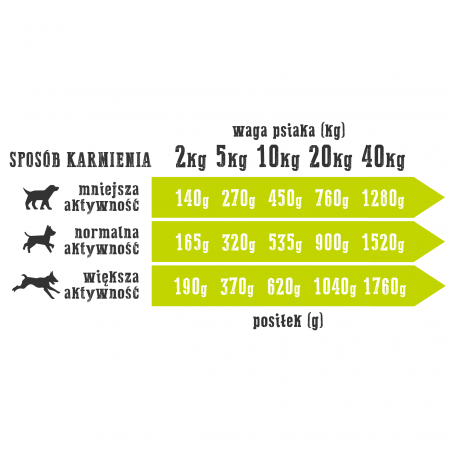 Sposób karmienia: Podane w tabeli wielkości posiłku są orientacyjne. Obserwuj swojego czworonoga i zmniejsz lub zwiększ wielkość posiłku w razie potrzeby.