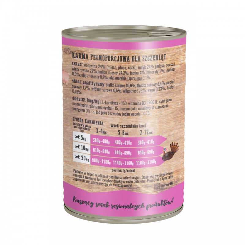 Wiejska Zagroda Mięsna uczta dla szczeniąt to pełnoporcjowa mokra karma dla szczeniąt.