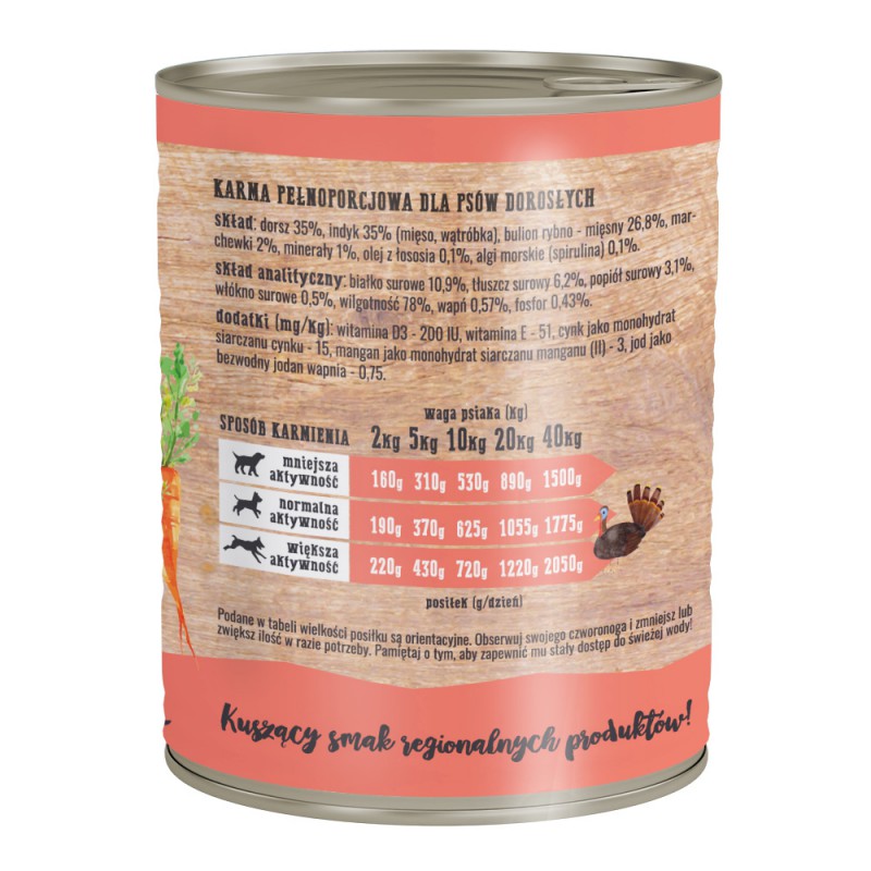 Podstawą posiłku jest zatem duet starannie wybranych ryb i mięsa, zatopionych w aromatycznym bulionie. Połączenie chudego mięsa dorsza z lekkostrawnym indykiem to świetny wybór dla psów, szczególnie tych aktywnych. Wartościowym dodatkiem do mięsnej uczty jest świeży olej z łososia, czyli bogactwo kwasów tłuszczowych Omega 3 EPA i DHA, cennych dla sierści i skóry Twojego psa. Kolejnym wyjątkowym składnikiem są dobroczynne algi morskie, które stanowią bogactwo witamin, minerałów oraz wartościowych substancji odżywczych. Proste składniki, bez zbędnych dodatków jak zboża, soja czy polepszacze smaku to nasz przepis na zdrowie i witalność Twojego pupila.