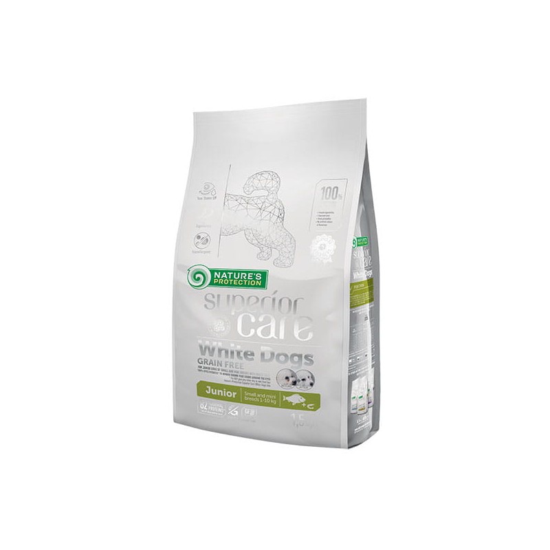 Karma sucha dla szczeniąt małych ras o białej sierści Nature's Protection Superior Care White Fish Junior Small to autorska formuła, która pomaga w zapobieganiu rdzawym zaciekom, powodującym odbarwienie włosów wokół oczu, łap i pyszczka. Problem łzawienia oczu może dotyczyć szczeniąt już od pierwszych chwil życia. Dlatego karma dla szczeniąt białych ras przeznaczona jest do walki z rdzawymi zaciekami już od najmłodszego wieku. Czym ten produkt różni się od karmy dla dorosłych, białych psów? – przede wszystkim różni się zawartością białka, witamin i minerałów, które zapewniają odpowiedni poziom energii i wzmacniają ciało rosnącego psa. Ta karma zapewnia prawidłowe przyrosty masy, nadaje się także dla lepszego odżywienia psów przed wystawami oraz dla suk karmiących.
