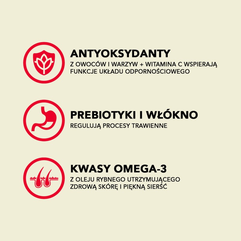 Kompozycja uzupełniona jest wartościowymi warzywami, owocami i ziołami, jak m.in. świeża cała dynia, świeża cała marchew, świeże całe gruszki, świeży jarmuż, suszony korzeń cykorii, cała żurawina, całe borówki, ostropest plamisty, lawenda, wpływającymi korzystnie na organizm psa.