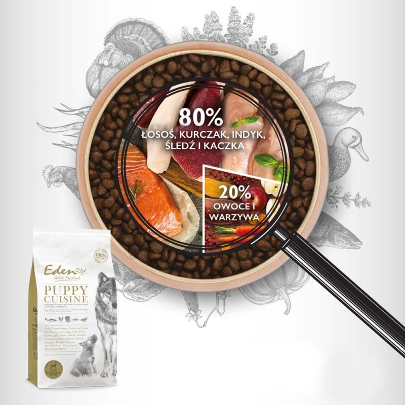 Karma dla szczeniąt Eden Puppy jest tworzona wyłącznie z najlepszych składników: łososia, kurczaka, indyka, śledzia, kaczki, warzyw i ziół. Mięso z łososia jest bogatym źródłem kwasów tłuszczowych omega 3, wspomagających wzrok i rozwój mózgu, a także układ odpornościowy, o dodatkowych właściwościach przeciwzapalnych. Drób dostarcza kwasów tłuszczowych Omega-6, które wpływają korzystnie na skórę i sierść, a zawarte w nim aminokwasy pomagają utrzymać zdrowe kości Twojego pupila. Chude mięso z kaczki jest dostarcza lekkostrawnego białka, witamin z grupy B i fosforu, wspierając kości i zęby. Karma została opracowana przy ścisłej współpracy lekarzy weterynarii oraz dietetyków. Produkt zgodny z założeniami diety ancestralnej, zwanej "dietą przodków" z wysoką zawartością białka dostosowanego do spożycia przez zwierzęta.