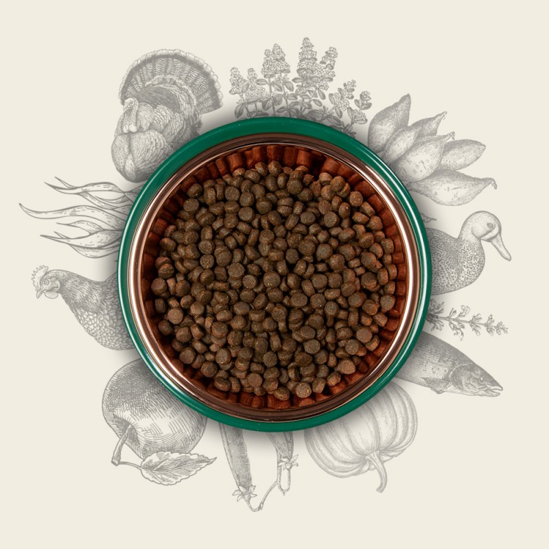 Skład: Świeżo przygotowany łosoś (23,5%), świeżo przygotowany kurczak (20,5%), suszony kurczak (10,5%), świeżo przygotowany indyk (9%), suszony batat (8,5%), suszona fasola (7%), tłuszcz z indyka ( 5%), lucerna, suszony łosoś (2,5%), suszone jajko (2,5%), suszony śledź (2%), suszona kaczka (2%), wątroba z indyka (2%), olej z łososia (1%), minerały, glukozamina 890 mg/kg, metylosulfonylometan 890 mg/kg, siarczan chondroityny 625 mg/kg, suszony ekstrakt z korzenia cykorii (jako źródło fruktooligosacharydów (prebiotyk FOS; 0,048%)), suszone jabłko, suszona marchew, suszony szpinak, suszona dynia, Sproszkowany korzeń łopianu, suszony rumianek, suszona żurawina, suszone wodorosty, suszona dzika róża, suszony anyż, suszona kozieradka, suszone zioła mieszane (oregano, szałwia, tymianek, pietruszka i majeranek)