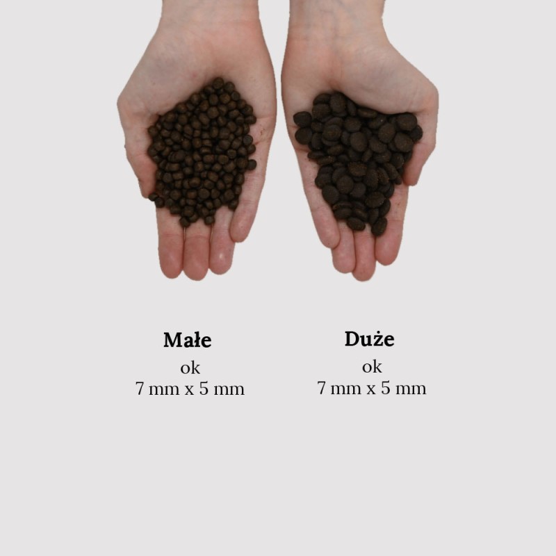 Skład analityczny: Białko 40%, Tłuszcz surowy 17.5%, Wilgotność 8%, Włókno surowe 3%, Popiół surowy 7.5%, Omega-6 4,4%, Omega-3 1,1%, Wapń 1,4%, Fosfor 1,1%