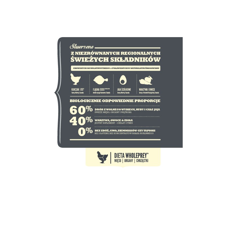 Skład: Świeże mięso kurczaka (16%), dehydratyzowany kurczak (15%), cała czerwona soczewica, cały groch zielony, cała ciecierzyca, dehydratyzowany indyk (4,5%), tłuszcz z kurczaka (4%), świeże organy kurczaka (wątroba, serce) (4%), dehydratyzowany śledź (4%), jaja (4%), surowa flądra (4%), olej rybny (4%), cała zielona soczewica, cały groch żółty, włókno grochu, skrobia grochowa, surowa wątroba indyka (0,5%), sól, suszony kelp, świeża cała dynia, świeża cała dynia piżmowa, świeża cała marchew, świeże całe jabłka, świeże całe gruszki, świeża cała cukinia, suszony korzeń cykorii, świeży jarmuż, świeży szpinak, świeże liście rzepy, świeże liście buraków, świeża cała żurawina, świeże całe borówki, świeże całe jagody saskatoon, kurkuma, ostropest plamisty, korzeń łopianu, lawenda, korzeń prawoślazu lekarskiego, owoce dzikiej róży.