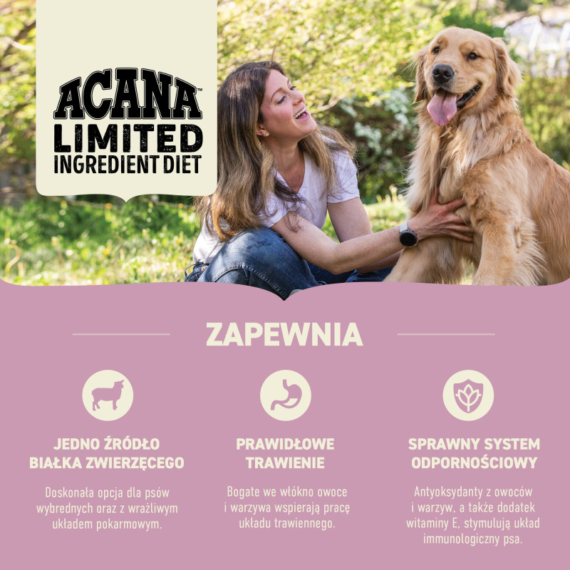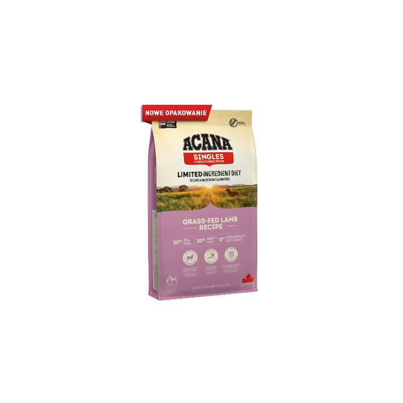 Bezzbożowa ACANA SINGLES Grass-Fed Lamb to karma monobiałkowa, która zawiera 50% jagnięciny, będącej źródłem łatwo przyswajalnego białka zwierzęcego. Idealne rozwiązanie dla psów wrażliwych wszystkich ras, z wyjątkiem szczeniąt dużych ras.
