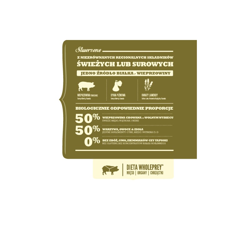 Skład: Świeża wieprzowina yorkshire (16%), dehydratyzowana wieprzowina (16%), cały groch zielony, cała czerwona soczewica, świeża wątroba wieprzowa (6%), tłuszcz wieprzowy (6%), świeże nerki wieprzowe (4%), świeża cała dynia piżmowa (4%), cała ciecierzyca, cała zielona soczewica, cały groch żółty, dehydratyzowane chrząstki wieprzowe (2%), włókno soczewicy, algi morskie (1.2%) (źródło DHA i EPA), świeża cała dynia, brązowy suszony kelp, liofilizowana wątroba wieprzowa (0.1%), sól, świeża cała żurawina, świeże całe borówki, korzeń cykorii, kurkuma, ostropest plamisty, korzeń łopianu, kwiat lawendy, korzeń prawoślazu lekarskiego, owoce dzikiej róży.
