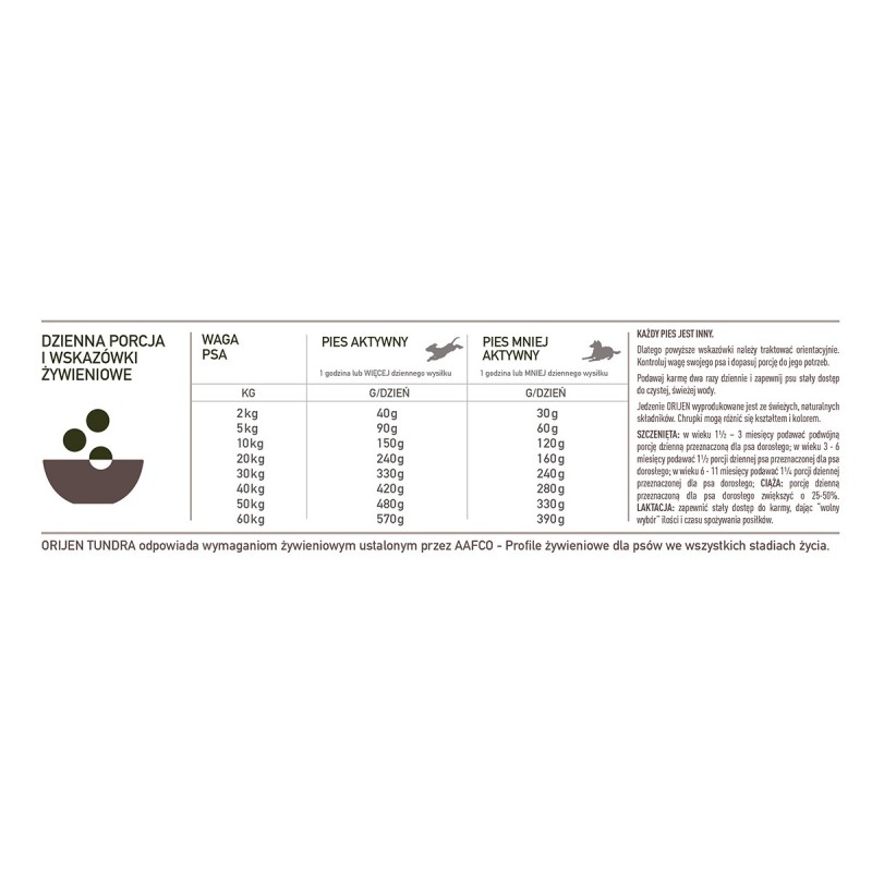 Karma Orijen Tundra to biologicznie odpowiednia, bardzo wysokiej jakości karma dla psów wszystkich ras na każdym etapie ich życia. 85% składników jest pochodzenia zwierzęcego - w tym 53% to świeże mięso i podroby kozie, dziczyzna, baranina, królik, kaczka oraz ryby. Mięso i składniki pochodzenia zwierzęcego zawarte w Orijen Tundra, pochodzą od zwierząt z naturalnego chowu od lokalnych farmerów i czystego, kanadyjskiego środowiska. Duża zawartość odżywczego mięsa pozwala utrzymać prawidłową masę mięśniową, a pozostałe składniki zapewniają niski indeks glikemiczny i pomagają zachować prawidłowy poziom cukru we krwi.