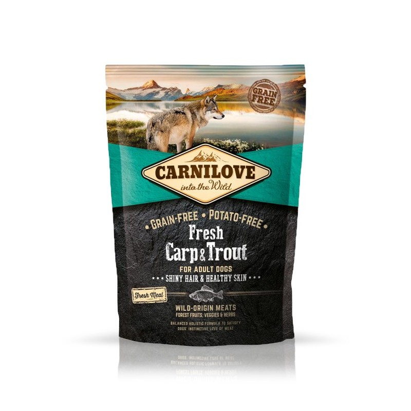 Carnilove Adult Fresh Catp & Trout to doskonałej jakości karma dla psów wszystkich ras, nie zawierająca ziemniaków, ani zbóż. Świetnie sprawdzi się również u psów alergików. Formuły karm Carnilove są tak zbilansowane, aby przypominały naturalną dietę psa. Zawierają mięso, mięśnie i kości z odpowiednim dodatkiem warzyw i ziół. Do karmy dodano owoce leśne i warzywa, które dostarczają organizm w potrzebne witaminy. Zawarte w formule karmy algi morskie są naturalnym źródłem minerałów, pierwiastków śladowych i aminokwasów. Wspomagają odporność psa, stymulując tarczycę oraz regulując przemianę materii. Dodatek oleju z łososia wspomaga piękną i zdrową skórę Twojego pupila oraz dba o jego piękna i lśniąca sierść. Kwasy tłuszczowe Omega-3 zawarte w oleju z łososia wspierają także układ nerwowy.