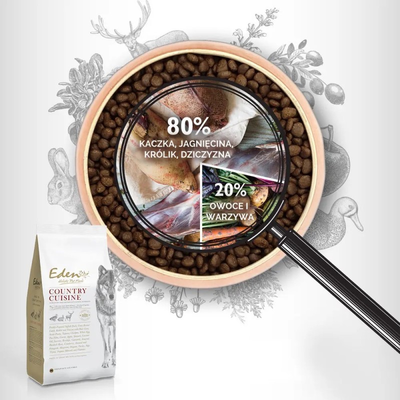 Karma Eden to pierwsza brytyjska karma, oceniana najlepiej ze wszystkich karm dostępnych na rynku zoologicznym. Powstała we współpracy wykwalifikowanych dietetyków i weterynarzy. Skład karmy oparty jest na Diecie Ancestralnej, która opiera się na pierwotnej diecie przodków, czyli naturalnej i holistycznej. Sucha karma Eden to kompletne pożywienie dla psów odzwierciedlające biologicznie zbilansowaną Dietę Ancestralną. Produkowane w Wielkiej Brytanii z brytyjskich składników najwyższej jakości: świeżych mięs, minerałów organicznych i witamin, owoców, warzyw i roślin. Eden nie stosuje żadnych zbóż ani ryżu, czyli składników, które nie są naturalną częścią Ancestralnej Diety psa.