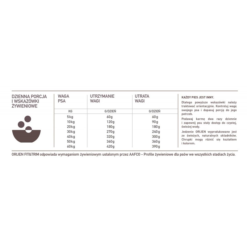 Karma Orijen Fit & Trim zawiera tylko 13% tłuszczy i aż 42% wartościowego białka, które pomaga w utrzymaniu dobrej kondycji Twojego psa. Polecana jest dla psów po kastracji lub z problemami z nadwagą. Zawiera L-karnitynę, która wzmacnia serce i pomaga transportować tłuszcze do mitochondrium, dzięki temu szybciej spalana jest tkanka tłuszczowa a pies ma więcej energii. Najwyższa jakość mięsa, ograniczony podaż węglowodanów oraz tłuszczów sprawia że jest to lekki posiłek. Dodatek ziół, które usprawniają trawienie sprawia, że produkt jest lekkostrawny a ilość odchodów jest mniejsza, a produkt jest lepiej przyswajalny przez psy.