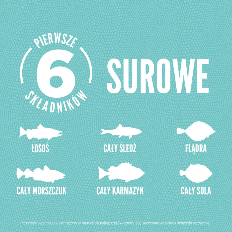 Skład: Surowy łosoś (17%), surowy cały śledź (16%), surowa flądra (7%), surowy cały morszczuk (6%), surowy cały karmazyn czerwonopasy (6%), surowa cała sola (6%), dehydratyzowany śledź (5%), dehydratyzowana sardynka (5%), dehydratyzowany mintaj (5%), dehydratyzowana makrela (5%), dehydratyzowany błękitek (5%), cała czerwona soczewica, cały groch, cała ciecierzyca, cała zielona soczewica, włókno soczewicy, cała fasola pinto, olej słonecznikowy, olej ze śledzia (2%), cała fasola biała, surowe zielone małże nowozelandzkie, suszony kelp, świeża cała dynia piżmowa, świeża cała dynia, suszony korzeń cykorii, świeże całe jabłka, świeża cała marchew, świeże całe gruszki, świeża cała cukinia, jukka mojave, świeże liście buraków, świeży jarmuż, świeży szpinak, świeże liście rzepy, cała żurawina, całe borówki, całe jagody saskatoon, kurkuma, ostropest plamisty, korzeń łopianu, lawenda, korzeń prawoślazu lekarskiego, owoce dzikiej róży.