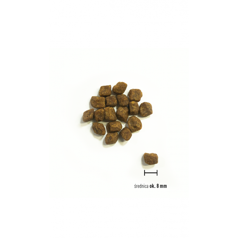 Skład analityczny: Białko surowe 38%, Oleje i tłuszcze surowe 20%, Popiół surowy 9%, Włókno surowe 4%, Wilgotność 12%, Wapń 1,3%, Fosfor 0,9%, Omega-6 3%, Omega-3 1%, DHA/EPA 0,25%/0,3%.