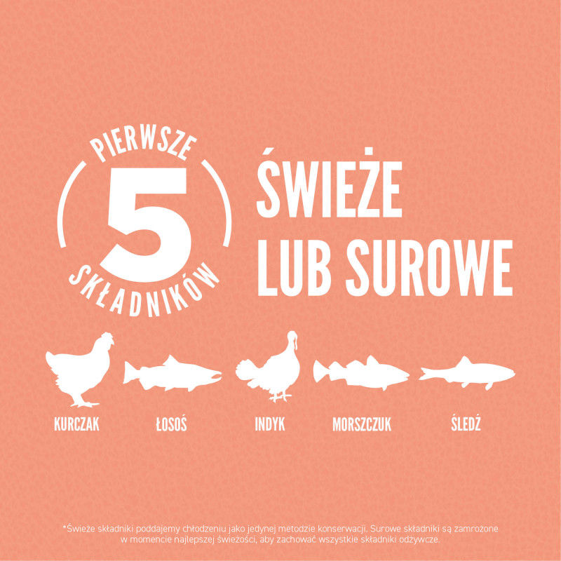 Skład: Świeży kurczak (18%), surowy łosoś (12%), surowy indyk (10%), surowy cały morszczuk (4%), surowy cały śledź (4%), surowa wątroba indyka (4%), świeże organy kurczaka (wątroba, serce) (4%), świeże jaja (4%), dehydratyzowany indyk (4%), dehydratyzowany kurczak (4%), dehydratyzowany śledź (4%), dehydratyzowana wątroba kurczaka (4%), dehydratyzowane jaja (4%), cała czerwona soczewica, cała fasola pinto, tłuszcz z kurczaka (3%), cała zielona soczewica, cała fasola biała, cała ciecierzyca, cały groch, olej z mintaja (2%), włókno soczewicy, surowe zielone nowozelandzkie małże, suszony kelp, świeża cała dynia piżmowa, świeża cała dynia, sól, suszony korzeń cykorii, świeże całe jabłka, świeża cała marchew, świeże całe gruszki, świeża cała cukinia, świeże liście buraków, świeży jarmuż, świeży szpinak, świeże liście rzepy, cała żurawina, całe borówki, całe jagody saskatoon, kurkuma, ostropest plamisty, korzeń łopianu, lawenda, korzeń prawoślazu lekarskiego, owoce dzikiej róży.