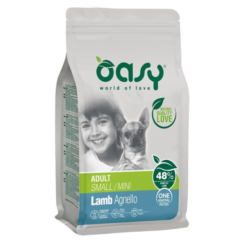 Oasy Adult S/Mini Jagnięcina to kompletna karma dla psów dorosłych ras małych i miniaturowych (powyżej 1 roku życia). W swoim składzie zawiera wyłącznie jedno źródło białka zwierzęcego - jagnięcinę. Karma jest znakomita dla psów z nietolerancją pokarmową, problemami skórnymi lub nadwrażliwością jelit. Inulina jest naturalnym źródłem prebiotyku FOS (fruktooligosacharydów), który wraz z MOS (oligosacharydy mannanowe) sprzyja prawidłowej równowadze flory bakteryjnej jelit. Ekstrakt z juki pomaga kontrolować zapach odchodów psa. Pulpa buraczana jest doskonałym źródłem błonnika i wspomaga regularną pracę jelit.