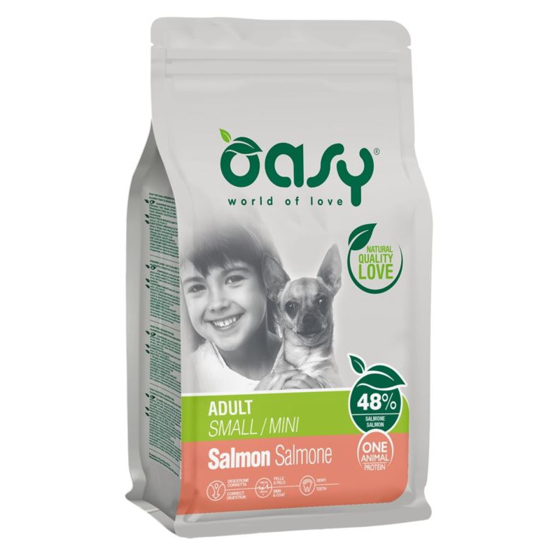 Oasy Adult S/Mini Łosoś to kompletna karma dla psów dorosłych ras małych i miniaturowych (powyżej 1 roku życia). W swoim składzie zawiera wyłącznie jedno źródło białka zwierzęcego - łososia. Karma jest znakomita dla psów z nietolerancją pokarmową, problemami skórnymi lub nadwrażliwością jelit. Inulina jest naturalnym źródłem prebiotyku FOS (fruktooligosacharydów), który wraz z MOS (oligosacharydy mannanowe) sprzyja prawidłowej równowadze flory bakteryjnej jelit. Ekstrakt z juki pomaga kontrolować zapach odchodów psa. Pulpa buraczana jest doskonałym źródłem błonnika i wspomaga regularną pracę jelit.