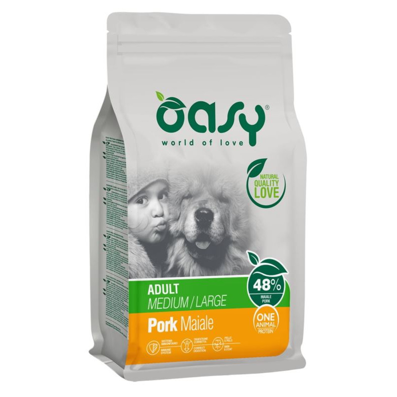 Oasy Adult M/L Wieprzowina to kompletna karma dla psów dorosłych ras średnich i dużych (powyżej 1 roku życia). W swoim składzie zawiera wyłącznie jedno źródło białka zwierzęcego - wieprzowinę. Karma jest znakomita dla psów z nietolerancją pokarmową, problemami skórnymi lub nadwrażliwością jelit. Inulina jest naturalnym źródłem prebiotyku FOS (fruktooligosacharydów), który wraz z MOS (oligosacharydy mannanowe) sprzyja prawidłowej równowadze flory bakteryjnej jelit. Ekstrakt z juki pomaga kontrolować zapach odchodów psa. Pulpa buraczana jest doskonałym źródłem błonnika i wspomaga regularną pracę jelit.