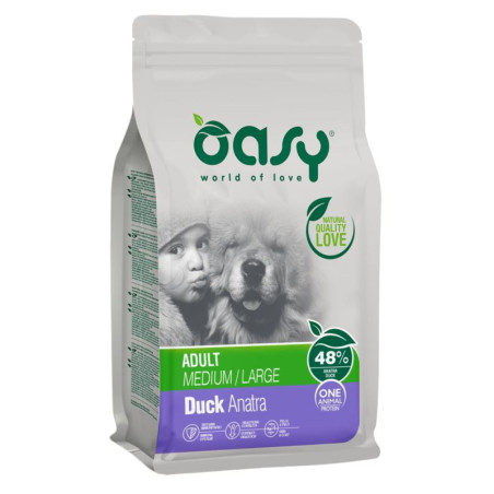 Oasy Adult M/L Kaczka to kompletna karma dla psów dorosłych ras średnich i dużych (powyżej 1 roku życia). W swoim składzie zawiera wyłącznie jedno źródło białka zwierzęcego - kaczkę. Karma jest znakomita dla psów z nietolerancją pokarmową, problemami skórnymi lub nadwrażliwością jelit. Inulina jest naturalnym źródłem prebiotyku FOS (fruktooligosacharydów), który wraz z MOS (oligosacharydy mannanowe) sprzyja prawidłowej równowadze flory bakteryjnej jelit. Ekstrakt z juki pomaga kontrolować zapach odchodów psa. Pulpa buraczana jest doskonałym źródłem błonnika i wspomaga regularną pracę jelit.