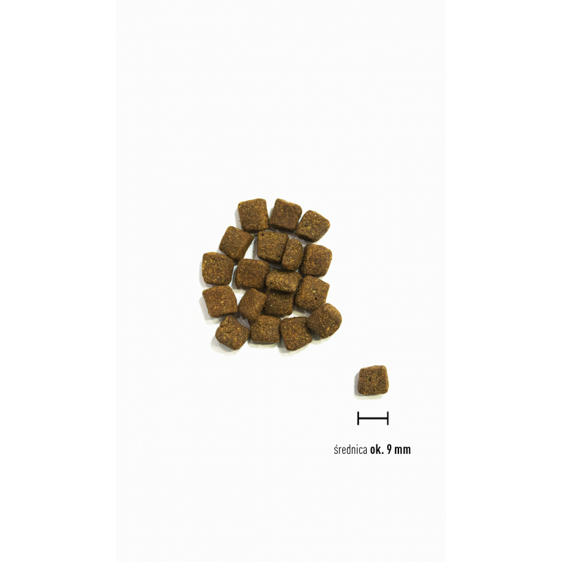 Skład analityczny: Białko surowe 40%, Oleje i tłuszcze surowe 15%, Popiół surowy 10%, Włókno surowe 4%, Wilgotność 12%, Wapń 1,5%, Fosfor 1,1%, Omega-6 2%, Omega-3 2%, DHA/EPA 0,5%/0,5%.
