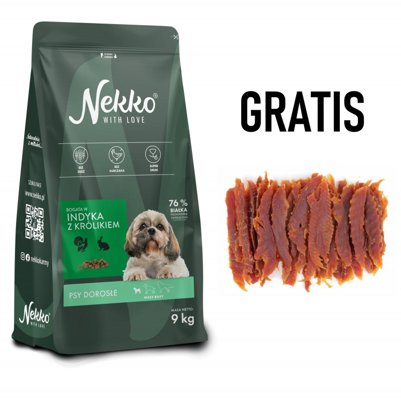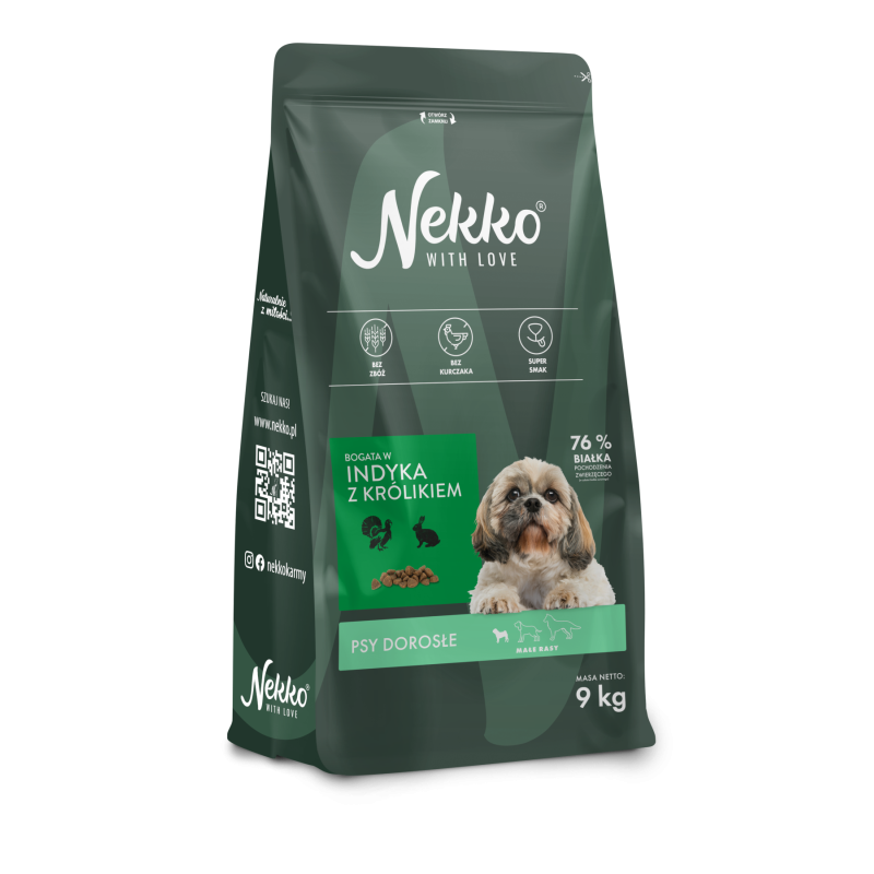 Nekko to pełnoporcjowa, sucha karma dla dorosłych psów, która wyróżnia się wysoką zawartością białka pochodzenia zwierzęcego oraz wyjątkową smakowitością. Karma pozbawiona jest kurczaka, zbóż, kukurydzy oraz soi. Nie znajdziesz w niej również szkodliwych konserwantów i sztucznych barwników.