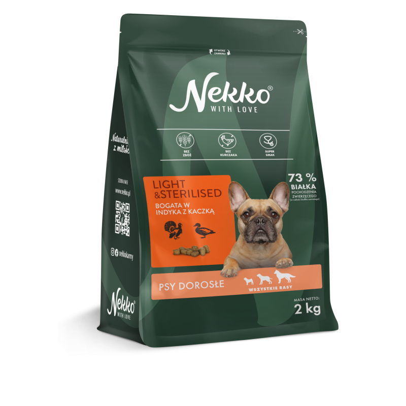 Sucha karma z indykiem i kaczką dla psów borykającymi się z nadwagą lub po zabiegu sterylizacji lub kastracji.