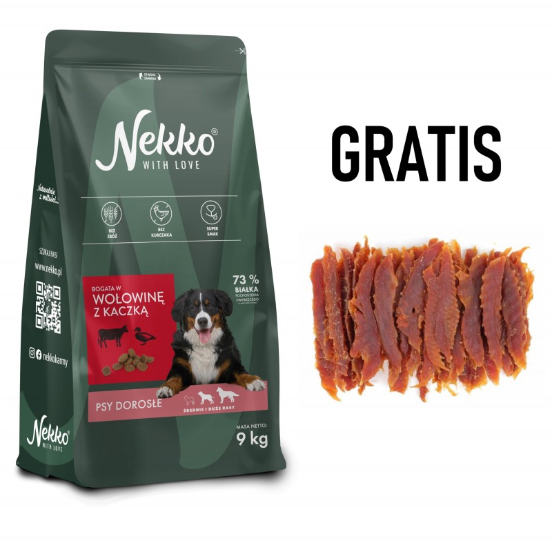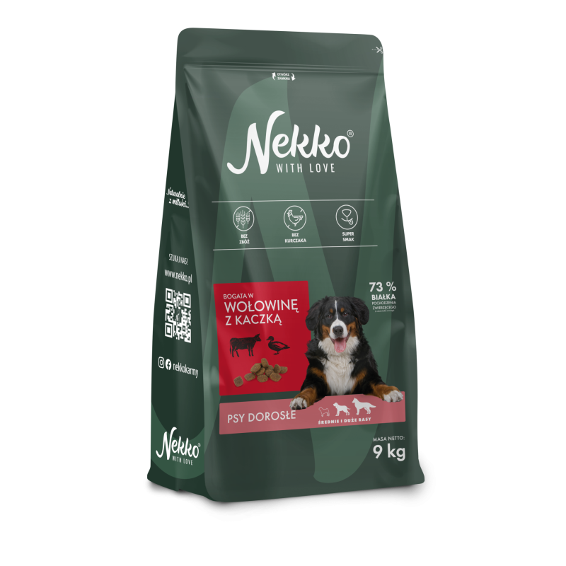 Nekko to pełnoporcjowa, sucha karma dla dorosłych psów, która wyróżnia się wysoką zawartością białka pochodzenia zwierzęcego oraz wyjątkową smakowitością. Karma pozbawiona jest kurczaka, zbóż, kukurydzy oraz soi. Nie znajdziesz w niej również szkodliwych konserwantów i sztucznych barwników.