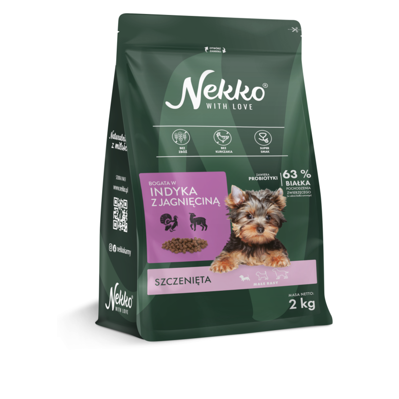 Nekko to pełnoporcjowa, sucha karma dla szczeniąt, która wyróżnia się wysoką zawartością białka pochodzenia zwierzęcego oraz wyjątkową smakowitością. Karma pozbawiona jest kurczaka, zbóż, kukurydzy oraz soi. Nie znajdziesz w niej również szkodliwych konserwantów i sztucznych barwników.