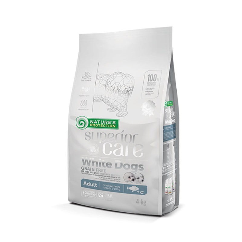 Karma sucha dla psów małych ras o białej sierści Nature's Protection Superior Care White Fish Adult Small to autorska formuła, która pomaga w zapobieganiu rdzawym zaciekom, powodującym odbarwienie włosów wokół oczu, łap i pyszczka. Problem łzawienia oczu może dotyczyć szczeniąt już od pierwszych chwil życia, dlatego karma dla szczeniąt białych ras przeznaczona jest do walki z rdzawymi zaciekami już od najmłodszego wieku. Czym ten produkt różni się od karmy dla dorosłych, białych psów? – przede wszystkim różni się zawartością białka, witamin i minerałów, które zapewniają odpowiedni poziom energii i wzmacniają ciało rosnącego psa. Ta karma zapewnia prawidłowe przyrosty masy, nadaje się także dla lepszego odżywienia psów przed wystawami oraz dla suk karmiących.