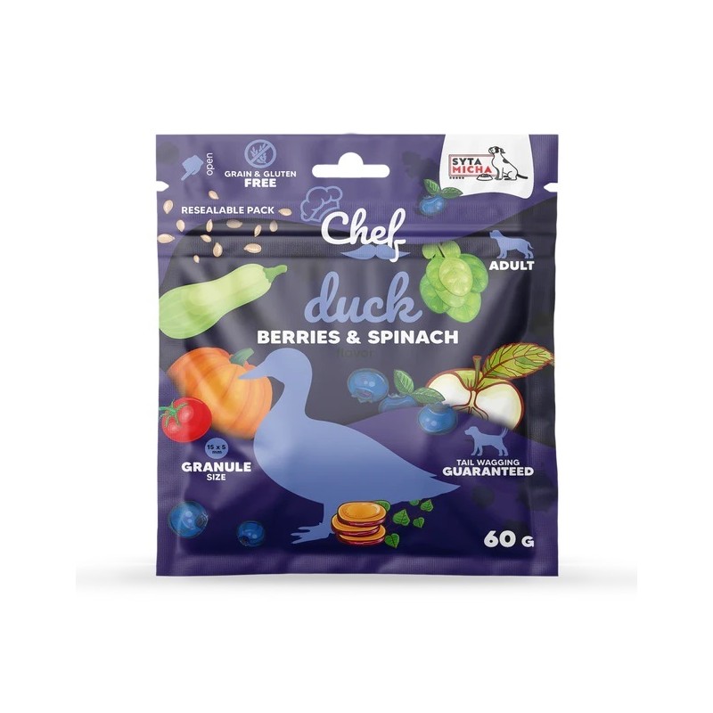 Syta Micha Kaczka, jagody i szpinak to bezzbożowa, monoproteinowa i pełnoporcjowa formuła dla każdego dorosłego psa. To odpowiednio zbilansowany posiłek, w którym na pierwszym miejscu znajdziemy aż 60% mięsa kaczki, doskonałego źródła białka, niezbędnego dla utrzymania masy mięśniowej i prawidłowej masy ciała.