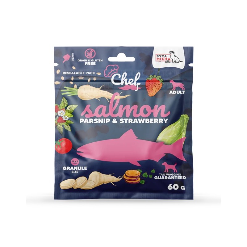 Syta Micha Łosoś, pasternak i truskawka to bezzbożowa i pełnoporcjowa formuła dla każdego dorosłego psa. To odpowiednio zbilansowany posiłek, w którym na pierwszym miejscu znajdziemy aż 60% mięsa łososia, mintaja i sardynki. To fantastyczne źródło wartościowego białka oraz kwasów tłuszczowych omega-3 niezbędnych dla utrzymania masy mięśniowej, prawidłowej masy ciała oraz pracy jelit, serca, mózgu, oczu i nawilżonej skóry.