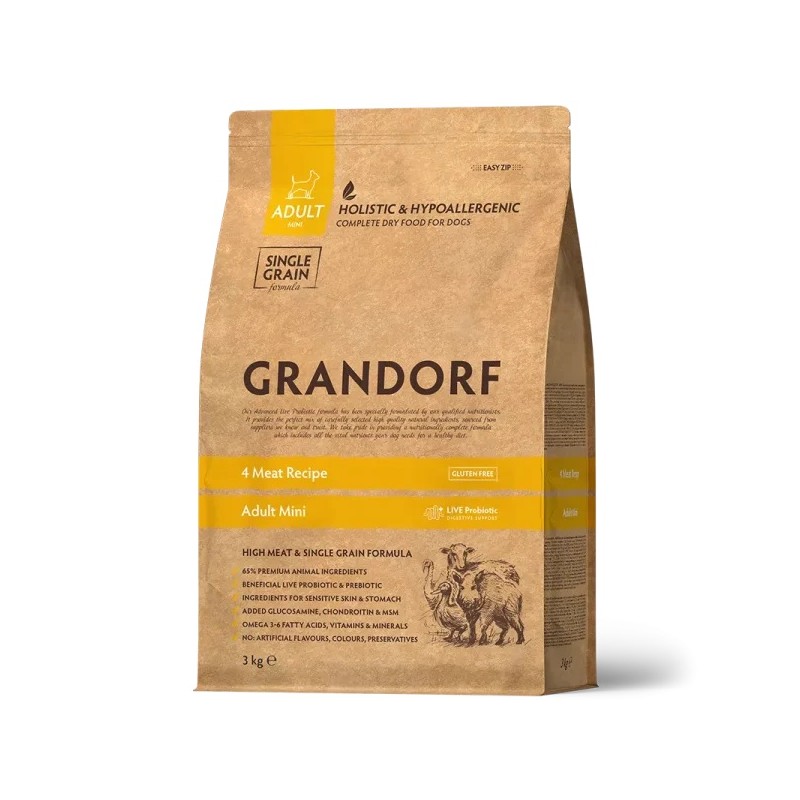 Dzięki hipoalergicznym składnikom bezglutenowa karma Grandorf Dog Adult 4 Meat jest lekkostrawna, ma wysoką wartość odżywczą i pomaga utrzymać zwierzę w zdrowiu i szczęściu przez lata. Miliard żywych probiotyków dziennie wspiera mikroflorę jelitową, poprawia trawienie, wchłanianie składników odżywczych i zapobiega alergiom.