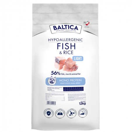 Baltica Nutraceutic Hypoallergenic Adult Fish & Rice Light to hipoalergiczna formuła stworzona na bazie suszonego mięsa ryb oraz lekkostrawnego ryżu. Posiłek wzbogacony wyjątkową kompozycją ziół i nutraceutyków o olbrzymich właściwościach prozdrowotnych. Odpowiedni dla psów wybrednych ras małych i miniaturowych z problemami trawiennymi lub nietolerancją pokarmową. Nie zawiera glutenu, kurczaka oraz roślin strączkowych. Zapewnia uczucie sytości na dłużej, odpowiednia dla zwierząt ze skłonnością do otyłości.